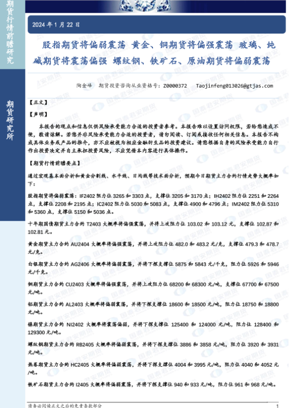 【国泰君安期货】【20240122】股指期货将偏弱震荡 黄金、铜期货将偏强震荡 玻璃、纯碱期货将震荡偏强 螺纹钢、铁矿石、原油期货将偏弱震荡-31页