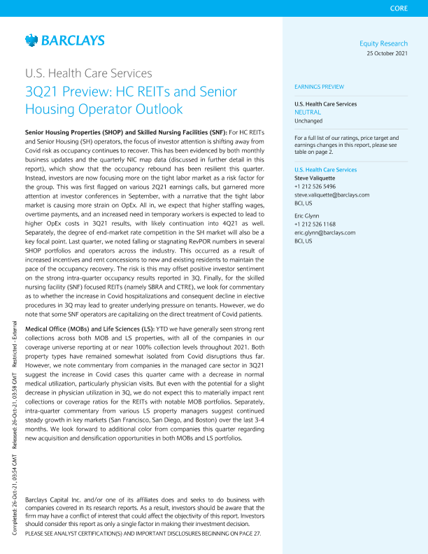 【Barclays Capital Inc.】【20211025】美股卫生保健服务行业-HC房地产投资信托基金和老人住宅房地产运营商展望-34页