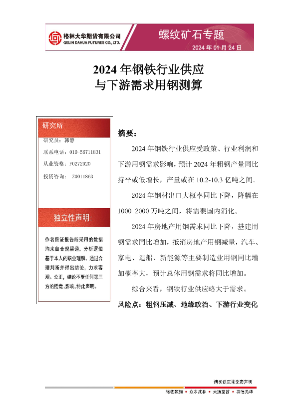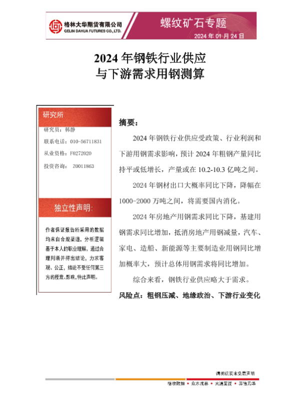 【格林大华期货】【20240124】螺纹矿石专题:2024年钢铁行业供应与下游需求用钢测算-28页