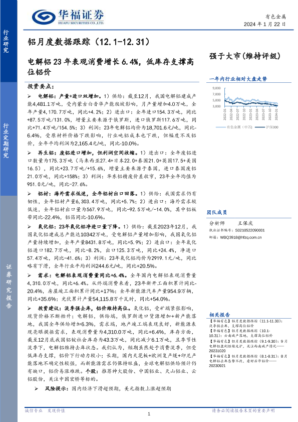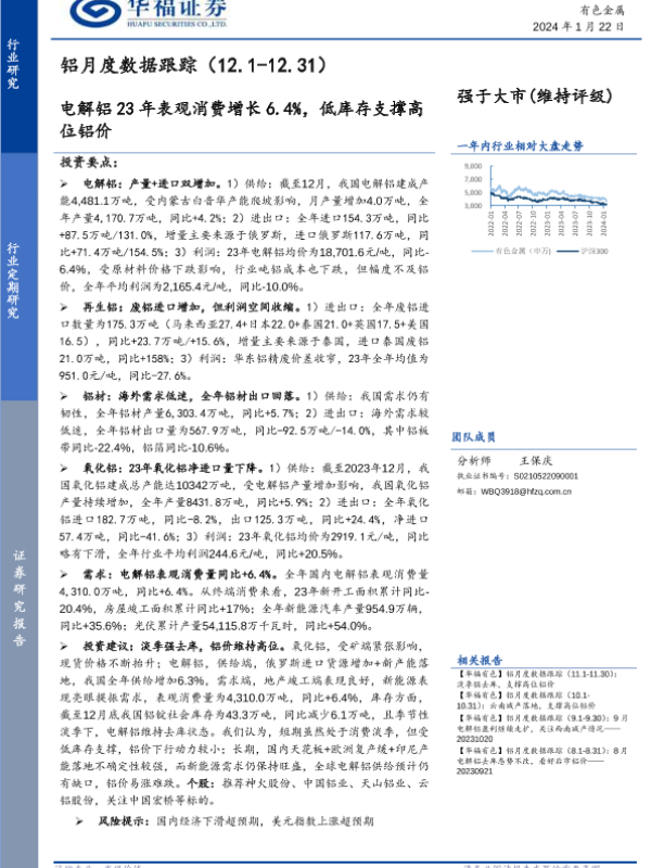 【华福证券】【20240122】铝月度数据跟踪:电解铝23年表观消费增长6.4%,低库存支撑高位铝价-13页