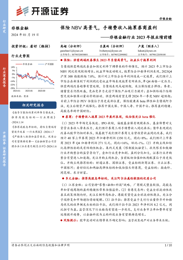 【开源证券】【20240119】非银金融行业2023年报业绩前瞻:保险NBV高景气,手续费收入拖累券商盈利-10页