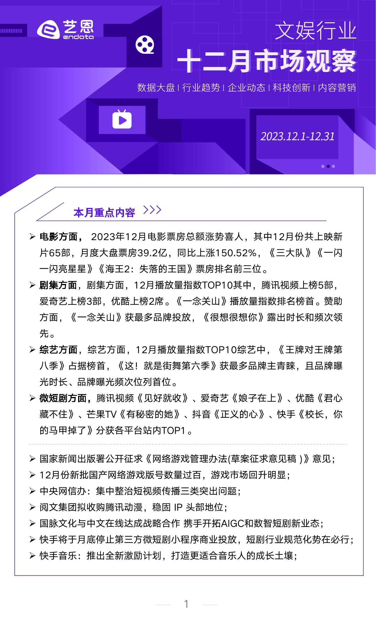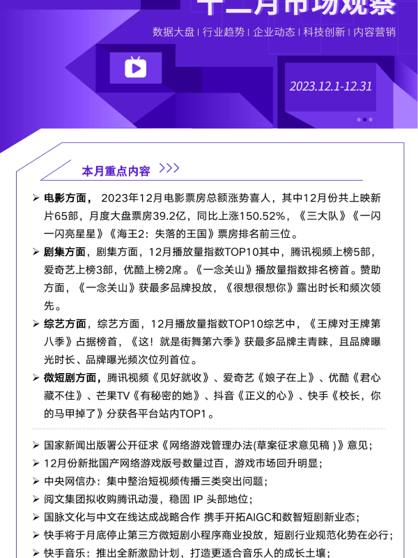 【艺恩ENDATA】【202401】2023年12月文娱行业市场观察-15页