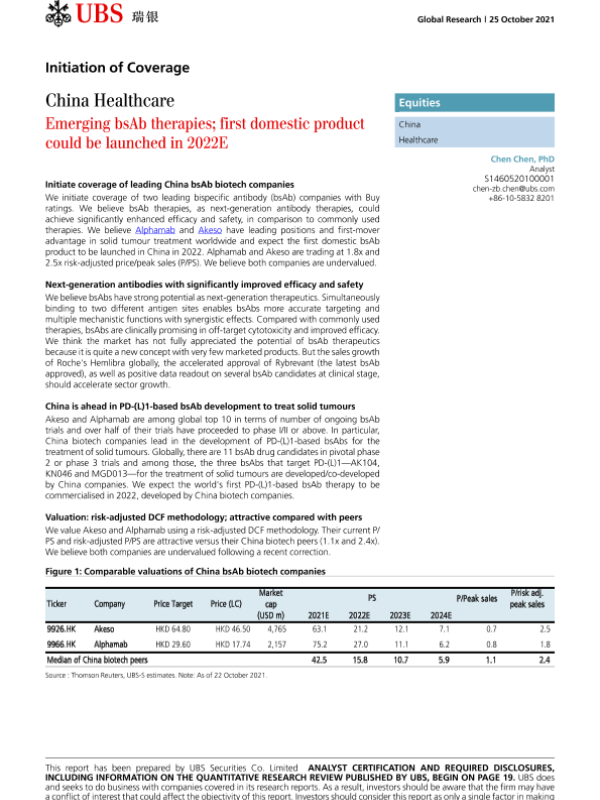 【瑞银】【20211025】中国医疗保健行业-新兴的双特异性抗体疗法;第一款国产产品可能在2022年推出-27页