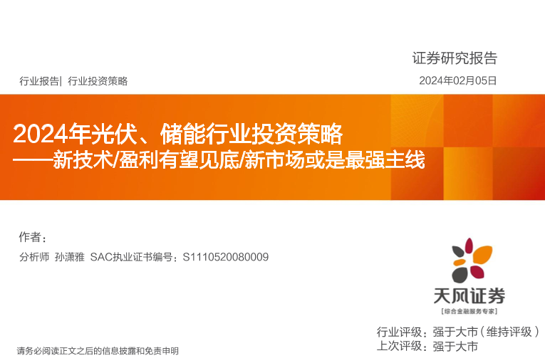 【天风证券】【20240205】2024年光伏、储能行业投资策略:新技术 盈利有望见底 新市场或是最强主线-46页