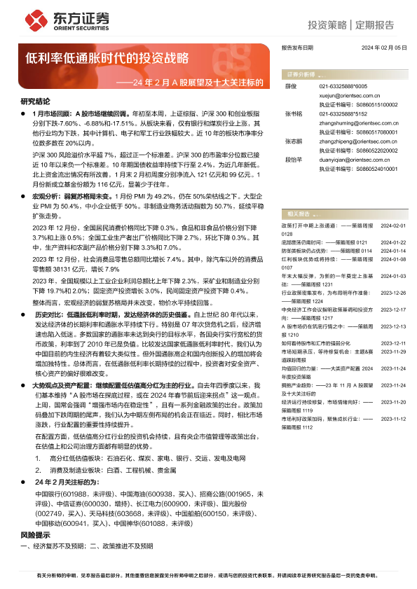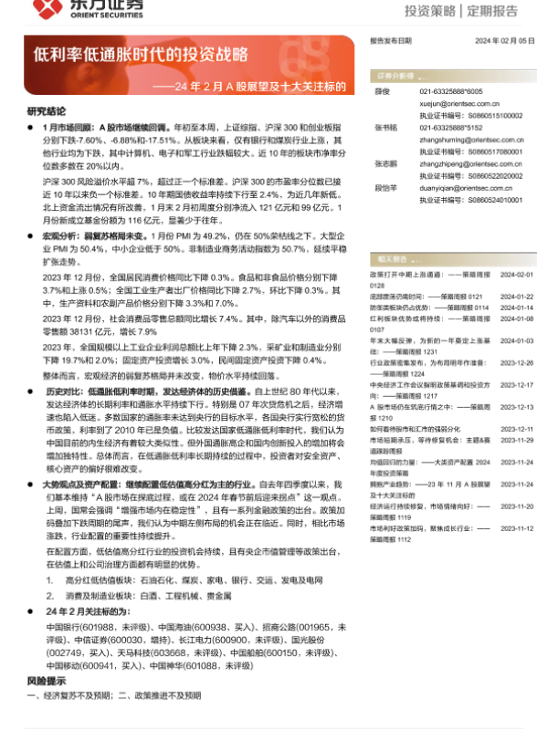 【东方证券】【20240205】24年2月A股展望及十大关注标的:低利率低通胀时代的投资战略-13页