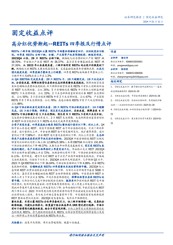 分红 四季报 固定收益 市场表现 REITs