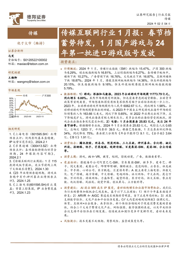 【德邦证券】【20240204】传媒互联网行业1月报:春节档蓄势待发,1月国产游戏与24年第一批进口游戏版号发放-15页