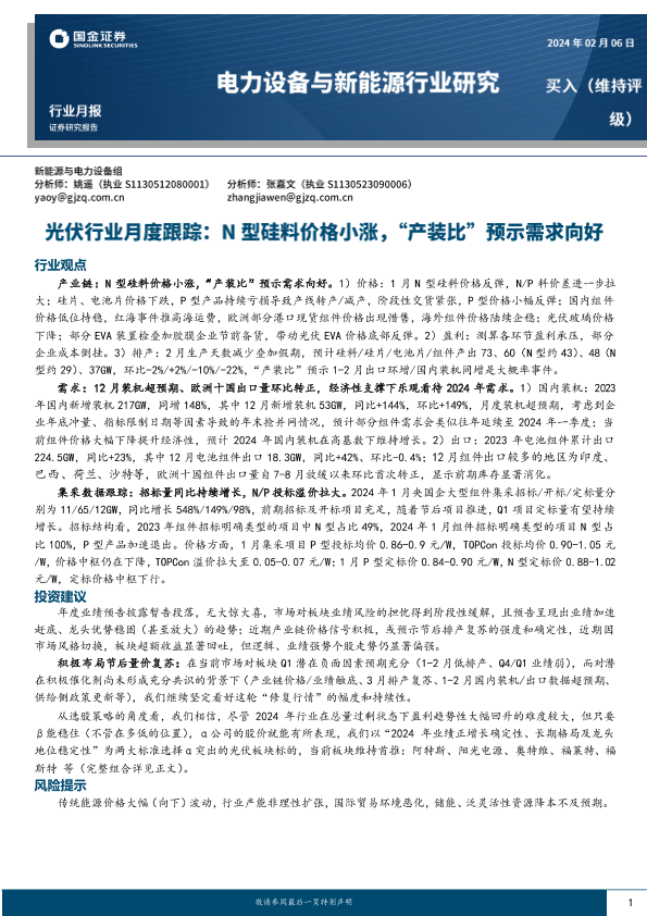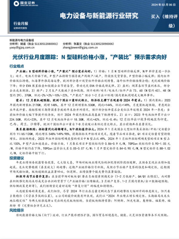 【国金证券】【20240206】光伏行业月度跟踪:N型硅料价格小涨,“产装比”预示需求向好-19页
