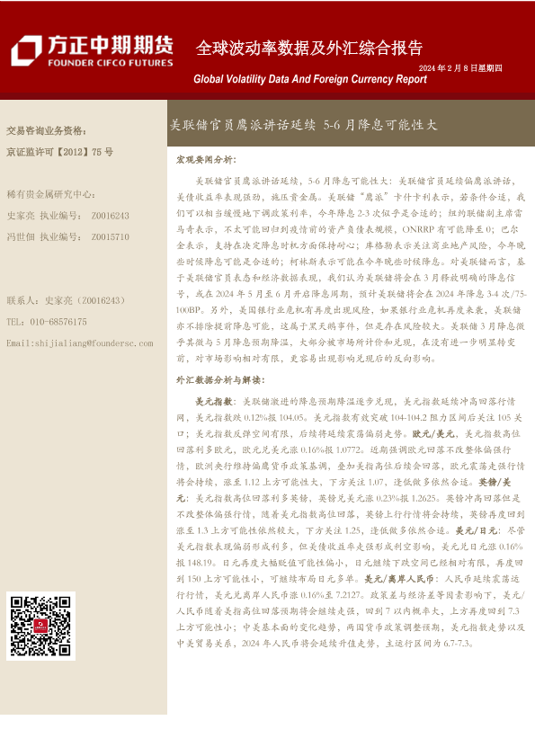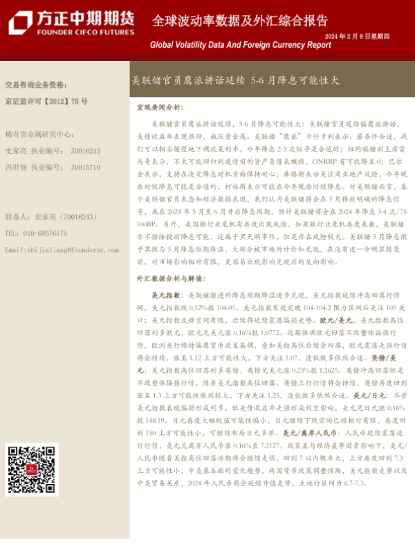 【方正中期期货】【20240208】全球波动率数据及外汇综合报告:美联储官员鹰派讲话延续 5-6月降息可能性大-18页