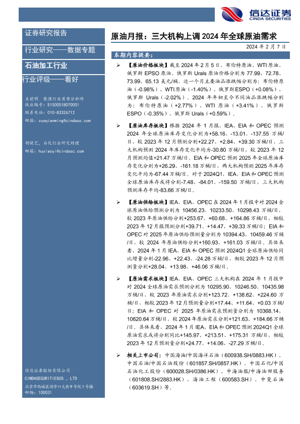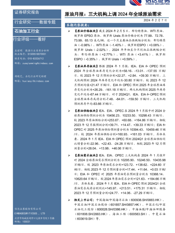 【信达证券】【20240207】原油月报:三大机构上调2024年全球原油需求-27页