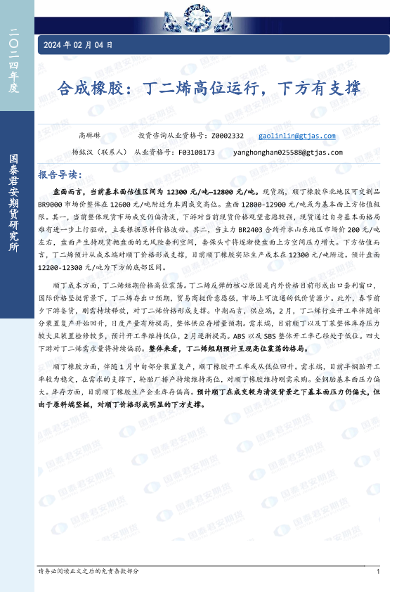 【国泰君安期货】【20240204】合成橡胶:丁二烯高位运行,下方有支撑-12页