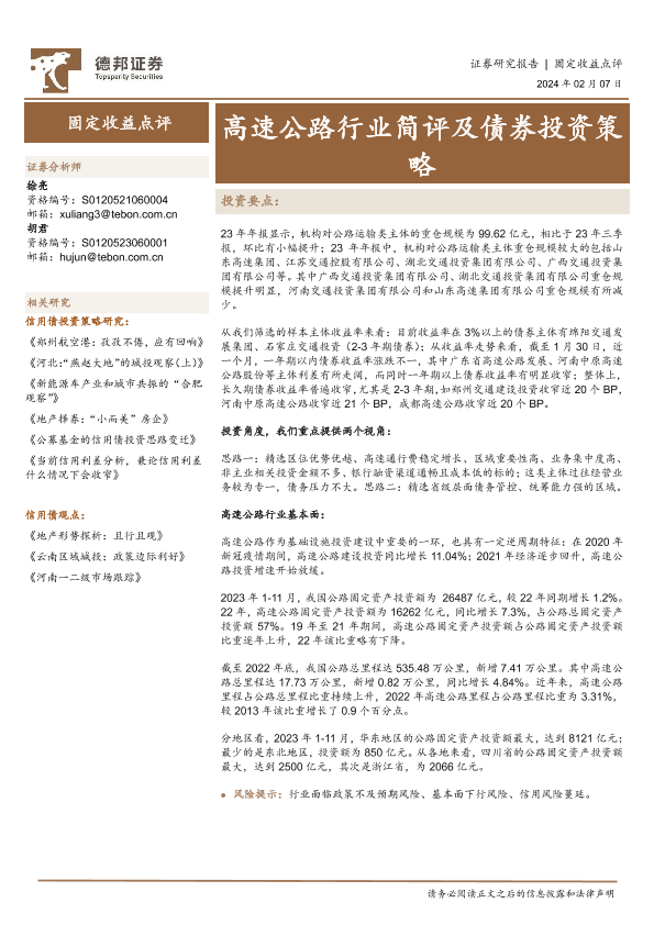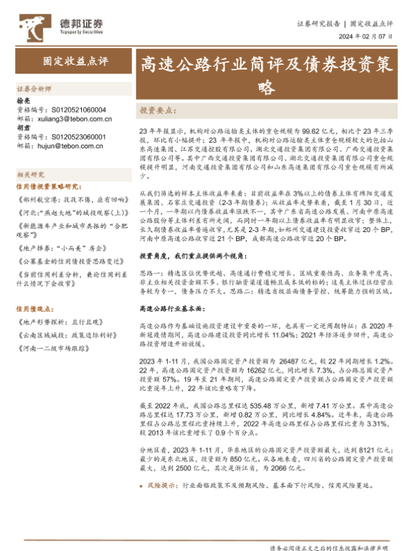 【德邦证券】【20240207】固定收益点评:高速公路行业简评及债券投资策略-11页
