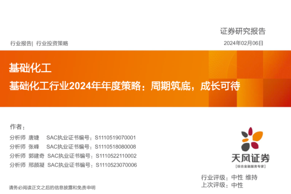 【天风证券】【20240206】基础化工行业2024年年度策略:周期筑底,成长可待-73页