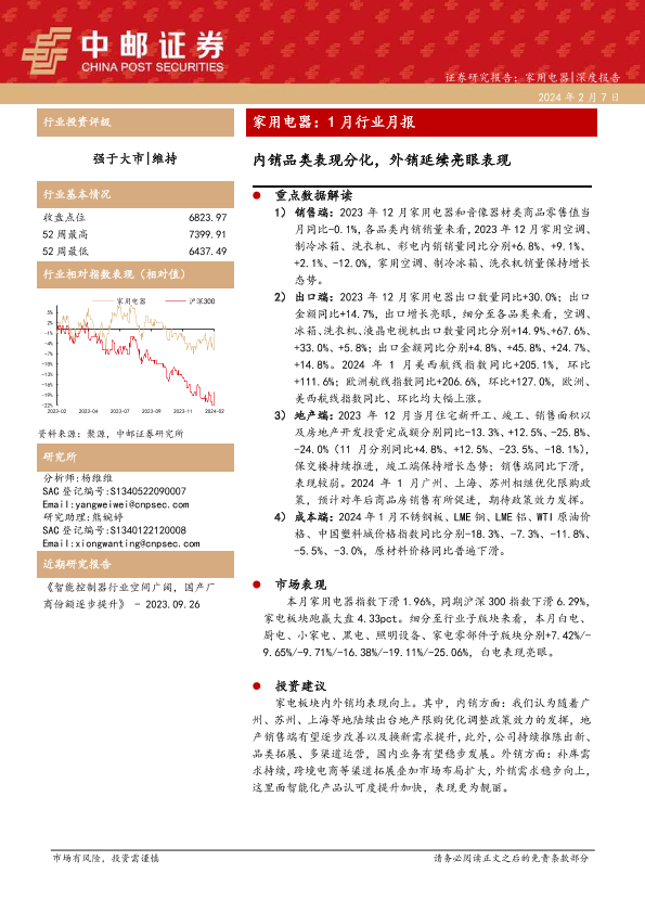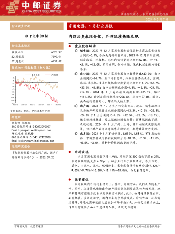 【中邮证券】【20240207】家用电器:1月行业月报:内销品类表现分化,外销延续亮眼表现-18页