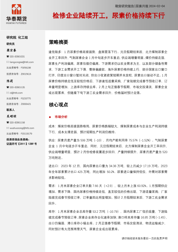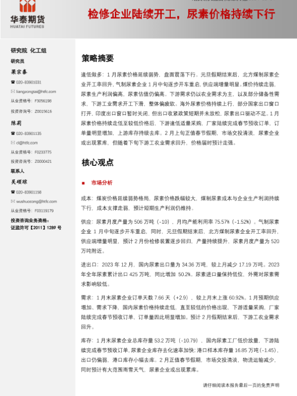 【华泰期货】【20240204】尿素月报:检修企业陆续开工,尿素价格持续下行-14页