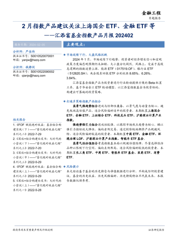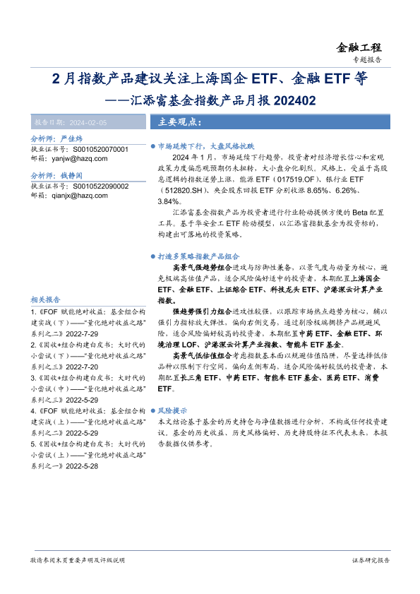 【华安证券】【20240205】汇添富基金指数产品月报:2月指数产品建议关注上海国企ETF、金融ETF等-18页