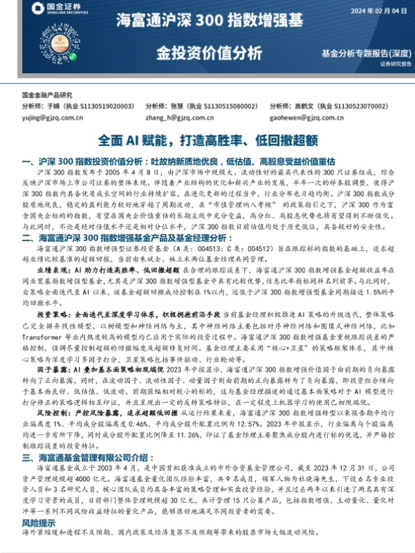 【国金证券】【20240204】海富通沪深300指数增强基金投资价值分析:全面AI赋能,打造高胜率、低回撤超额-12页
