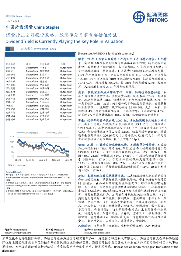 【海通国际】【20240205】消费行业2月投资策略:股息率是目前重要估值方法-48页