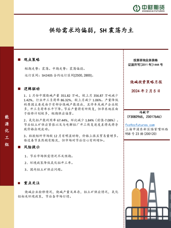 【中财期货】【20240205】烧碱投资策略月报:供给需求均偏弱,SH震荡为主-10页