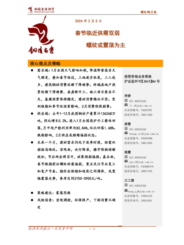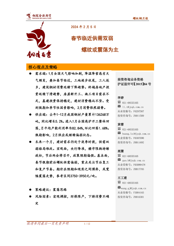 【金源期货】【20240205】螺纹钢月报:春节临近供需双弱 螺纹或震荡为主-12页