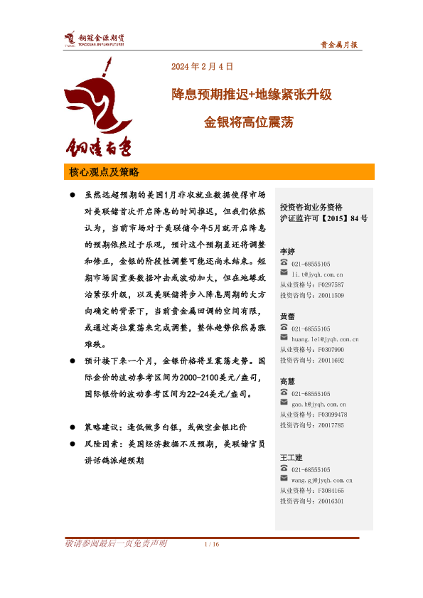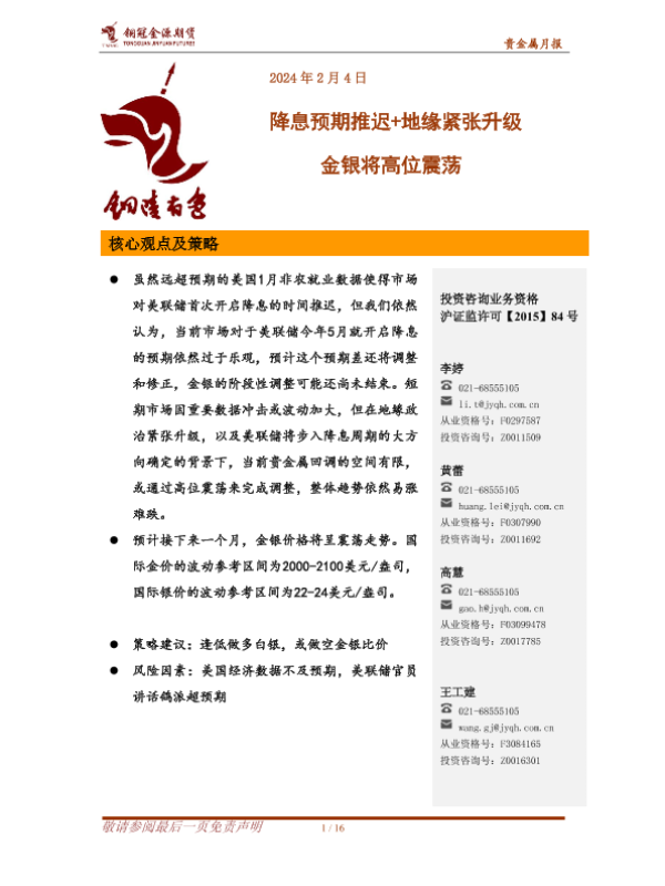 【金源期货】【20240204】贵金属月报:降息预期推迟+地缘紧张升级 金银将高位震荡-16页