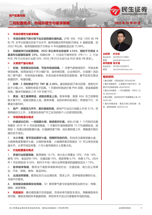 【民生证券】【20240205】资产配置月报:二月配置视点:市场非理性与破净策略-32页
