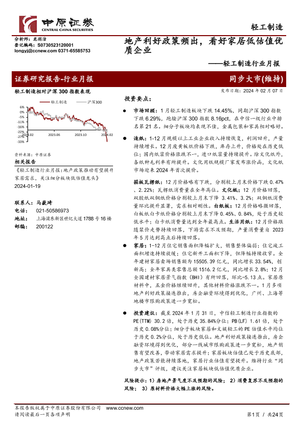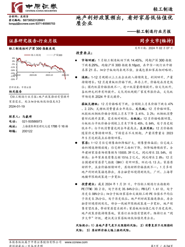 【中原证券】【20240207】轻工制造行业月报:地产利好政策频出,看好家居低估值优质企业-24页