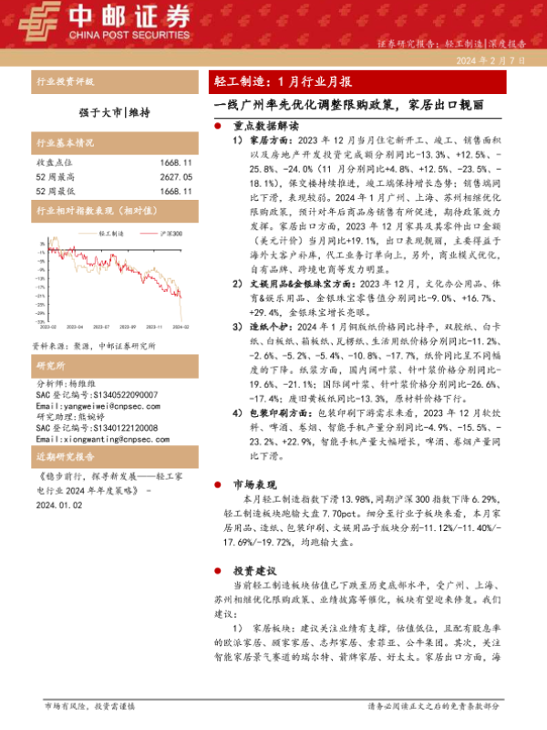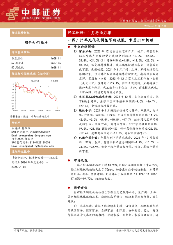 【中邮证券】【20240207】轻工制造:1月行业月报-一线广州率先优化调整限购政策,家居出口靓丽-24页