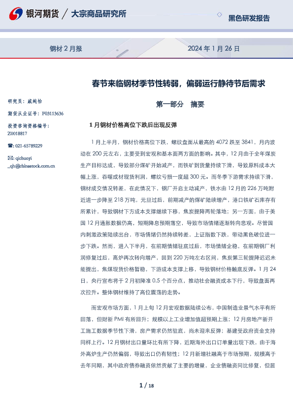 【银河期货】【20240126】钢材2月报:春节来临钢材季节性转弱,偏弱运行静待节后需求-18页