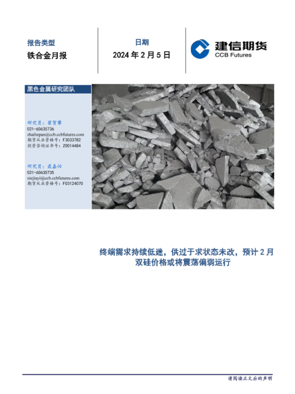【建信期货】【20240205】铁合金月报:终端需求持续低迷,供过于求状态未改,预计2月双硅价格或将震荡偏弱运行-18页