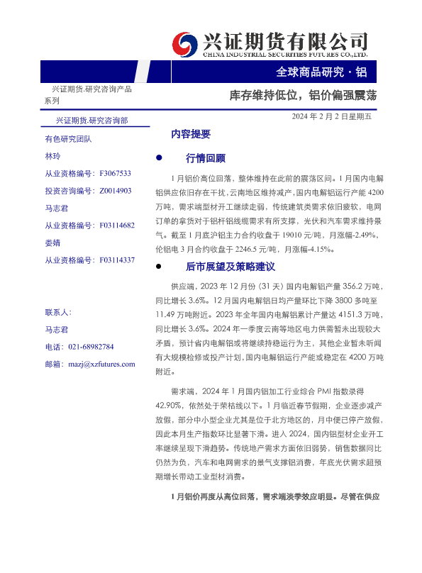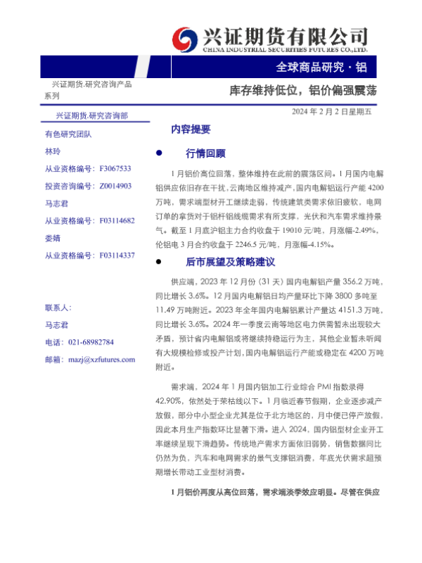【兴证期货】【20240202】铝月度报告:库存维持低位,铝价偏强震荡-19页