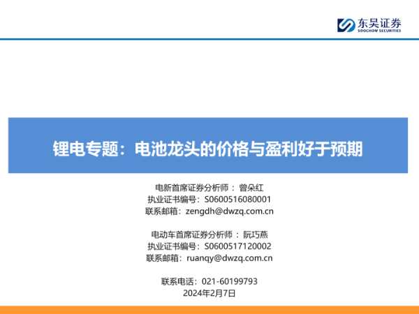 【东吴证券】【20240207】锂电专题:电池龙头的价格与盈利好于预期-19页