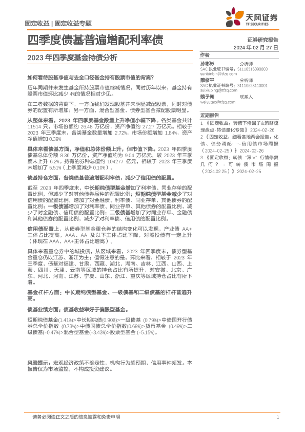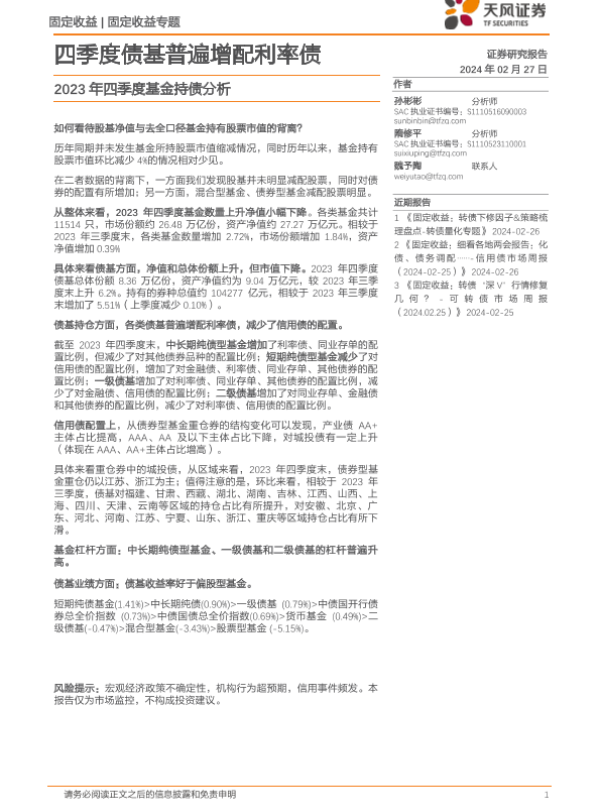 【天风证券】【20240227】2023年四季度基金持债分析:四季度债基普遍增配利率债-18页