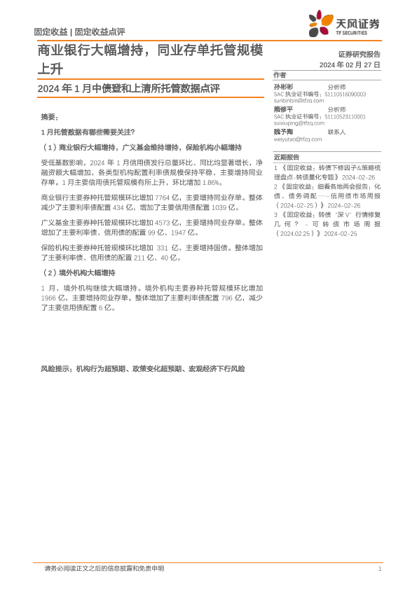 【天风证券】【20240227】2024年1月中债登和上清所托管数据点评:商业银行大幅增持,同业存单托管规模上升-12页