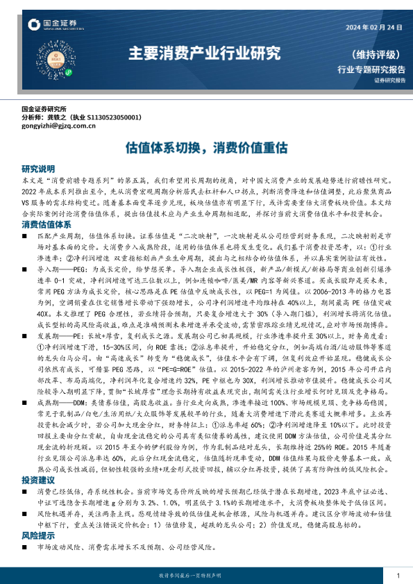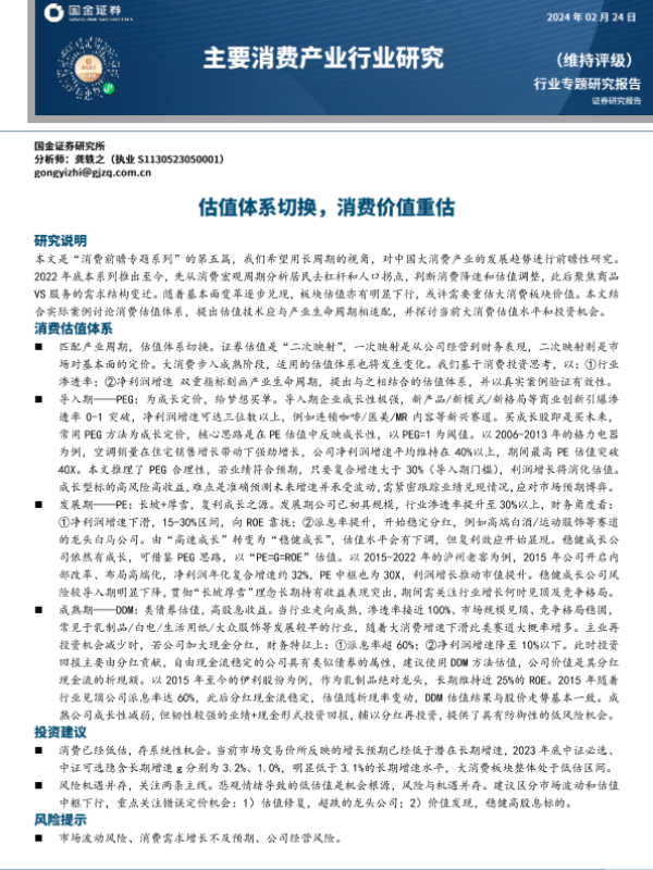 【国金证券】【20240224】主要消费产业行业研究:估值体系切换,消费价值重估-26页