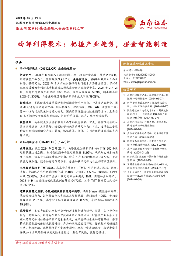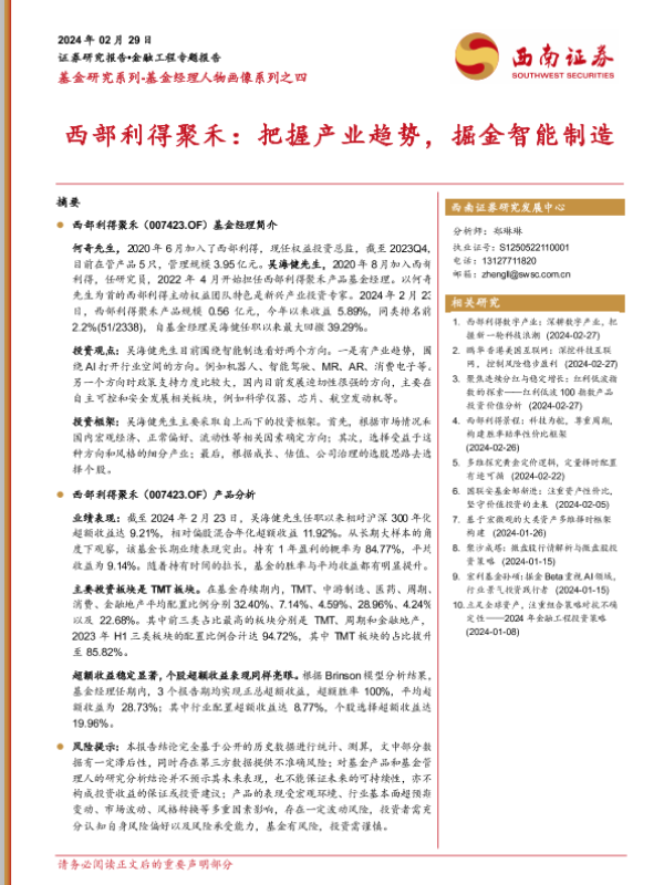 【西南证券】【20240229】基金研究系列-基金经理人物画像系列之四:西部利得聚禾:把握产业趋势,掘金智能制造-24页