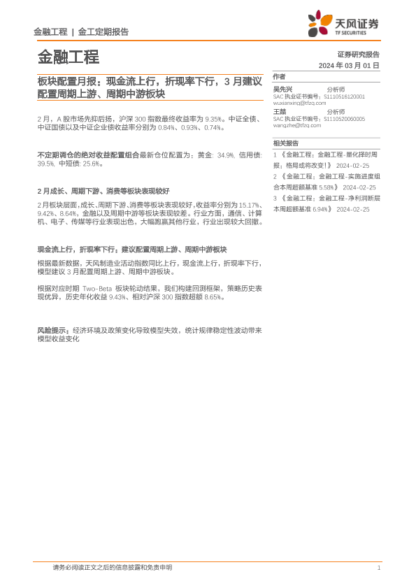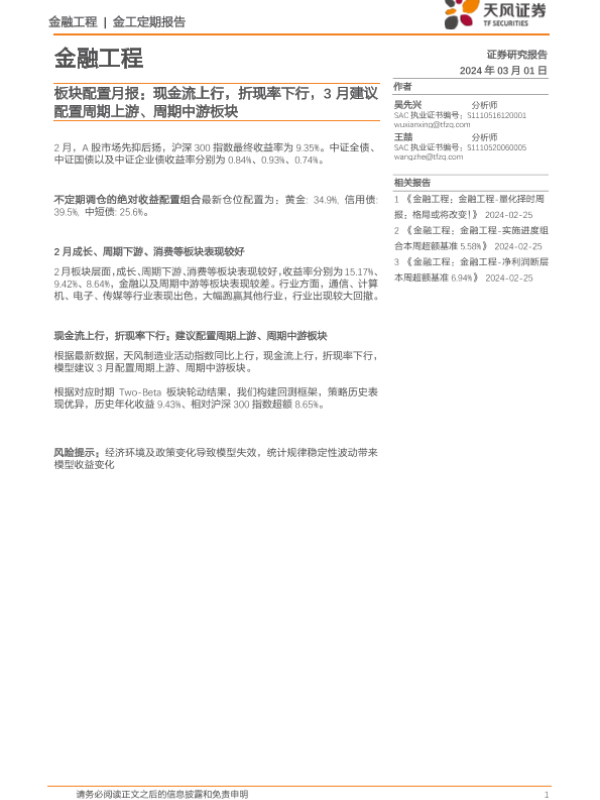 【天风证券】【20240301】板块配置月报:现金流上行,折现率下行,3月建议配置周期上游、周期中游板块-10页