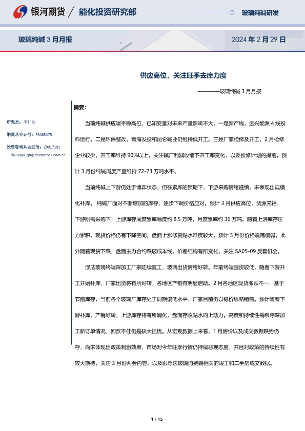 【银河期货】【20240229】玻璃纯碱3月月报:供应高位,关注旺季去库力度-15页
