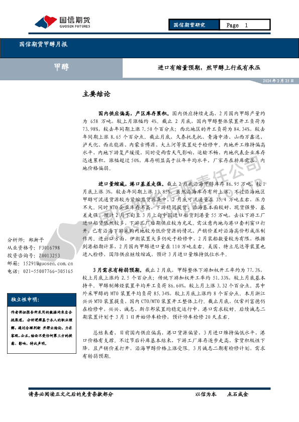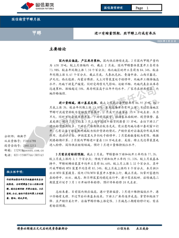 【国信期货】【20240225】甲醇月报:进口有缩量预期然,甲醇上行或有承压-12页