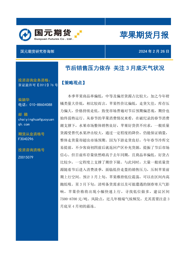 【国元期货】【20240226】苹果期货月报:节后销售压力依存 关注3月底天气状况-13页