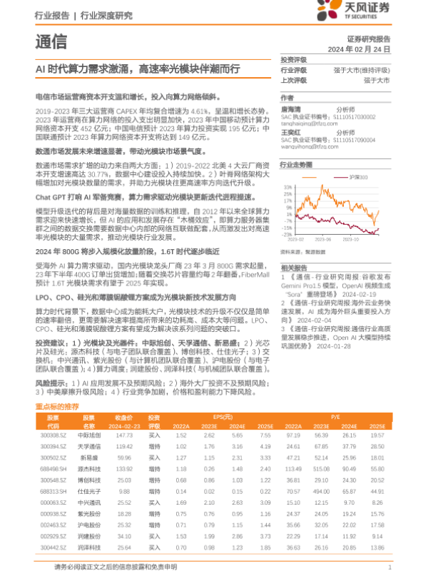 【天风证券】【20240224】通信行业深度研究:AI时代算力需求激涌,高速率光模块伴潮而行-25页