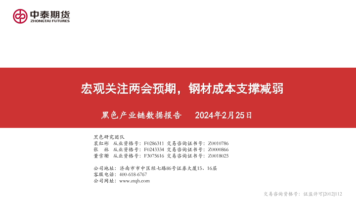 【中泰期货】【20240225】黑色产业链数据报告:宏观关注两会预期,钢材成本支撑减弱-144页