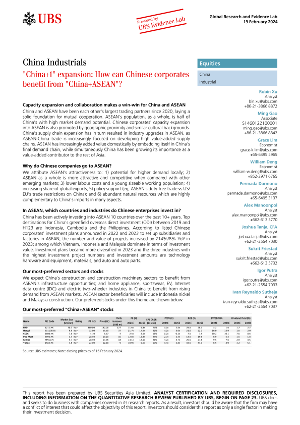 【UBS Securities Asia Limited】【20240219】UBS Equities-China Industrials 'China+1' expansion How can Chinese corporates benefit from 'China+ASEAN'?-33页