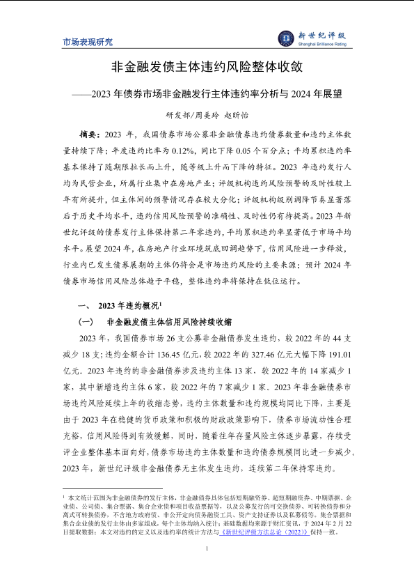 【研发部/周美玲赵昕怡】【20240222】非金融发债主体违约风险整体收敛——2023年债券市场非金融发行主体违约率分析与2024年展望-8页