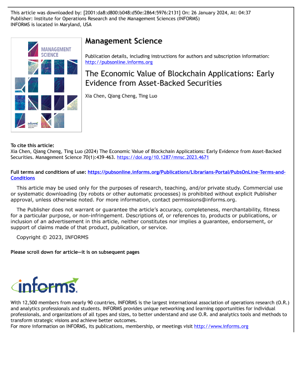 【Institute for Operations Research and the Management Sciences (INFORMS)】【20240126】The Economic Value of Blockchain Applications Early Evidence from Asset-Backed Securities-25页
