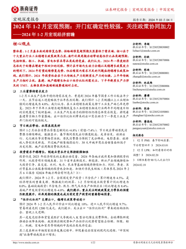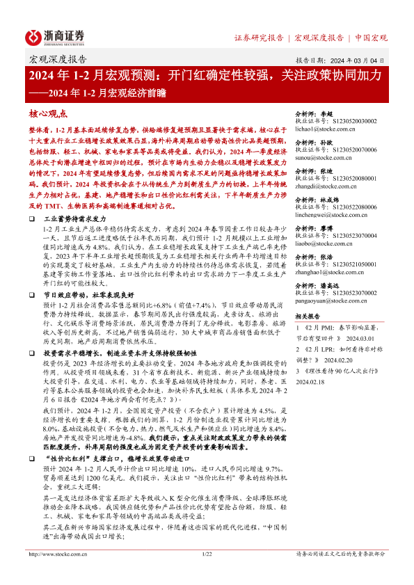 【浙商证券】【20240304】2024年1-2月宏观经济前瞻:2024年1-2月宏观预测:开门红确定性较强,关注政策协同加力-22页