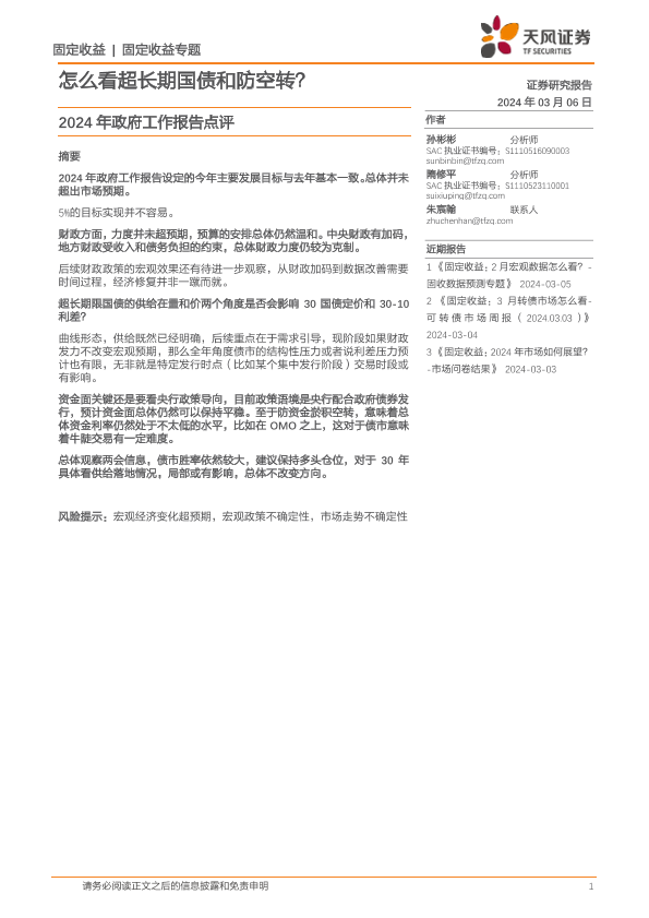 【天风证券】【20240306】2024年政府工作报告点评:怎么看超长期国债和防空转?-10页