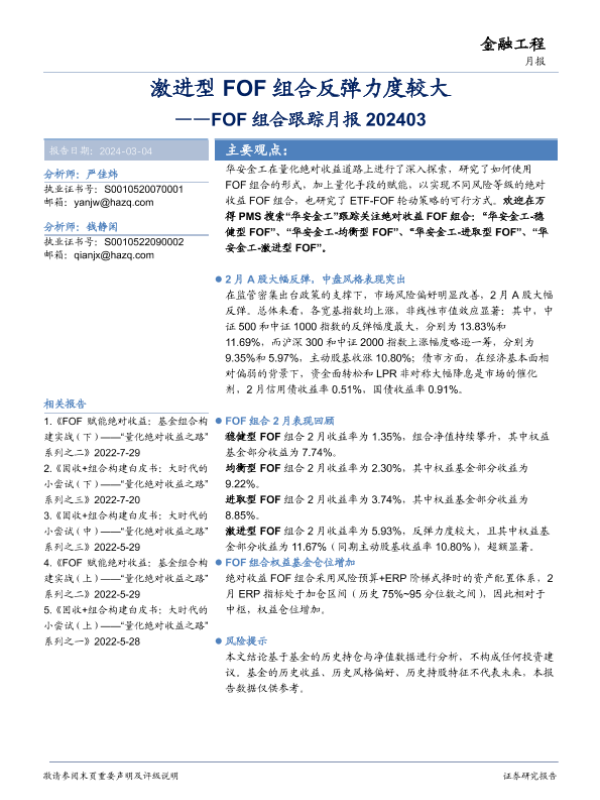 【华安证券】【20240304】FOF组合跟踪月报:激进型FOF组合反弹力度较大-14页
