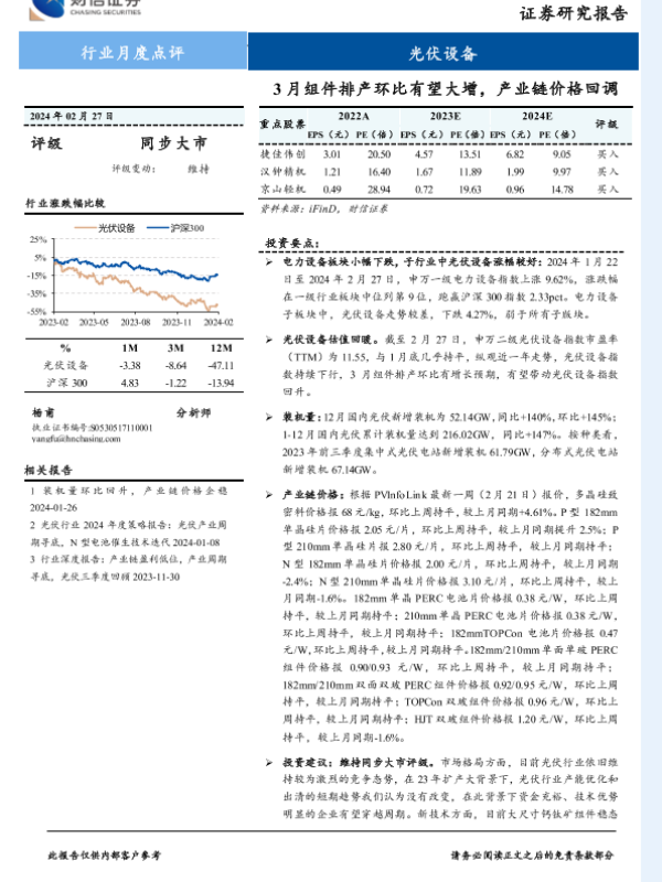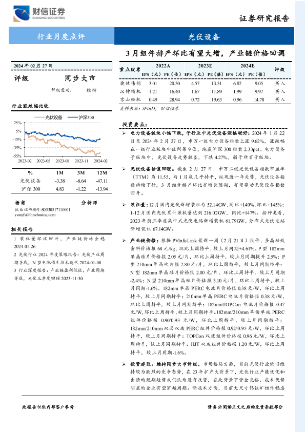 【财信证券】【20240227】光伏设备行业月度点评:3月组件排产环比有望大增,产业链价格回调-15页