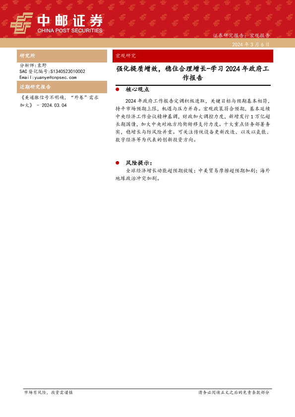 【中邮证券】【20240306】学习2024年政府工作报告:强化提质增效,稳住合理增长-13页